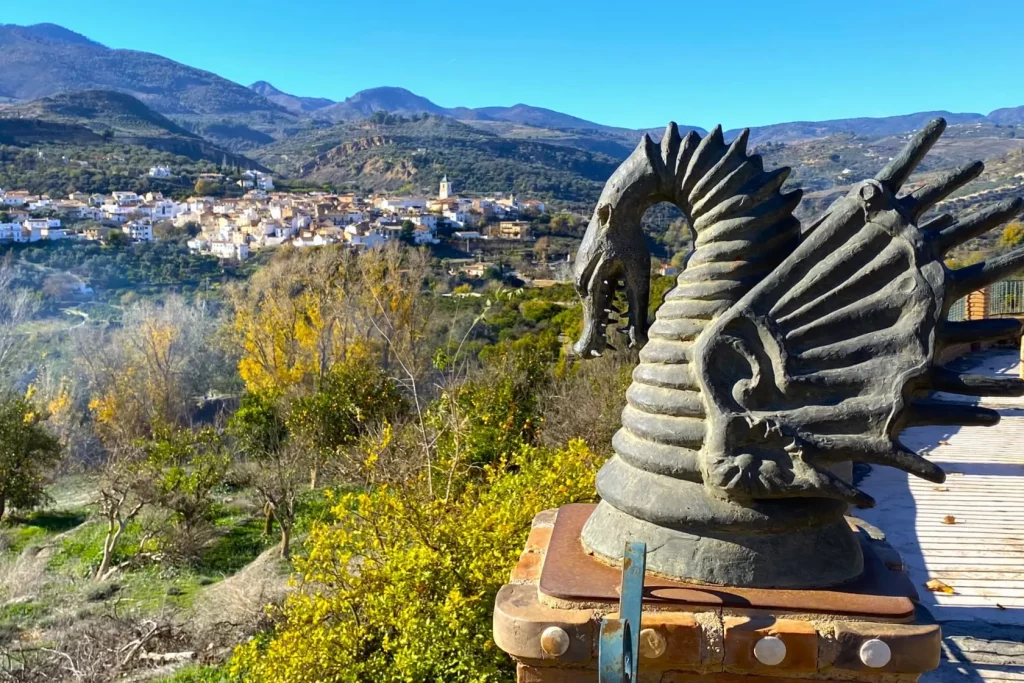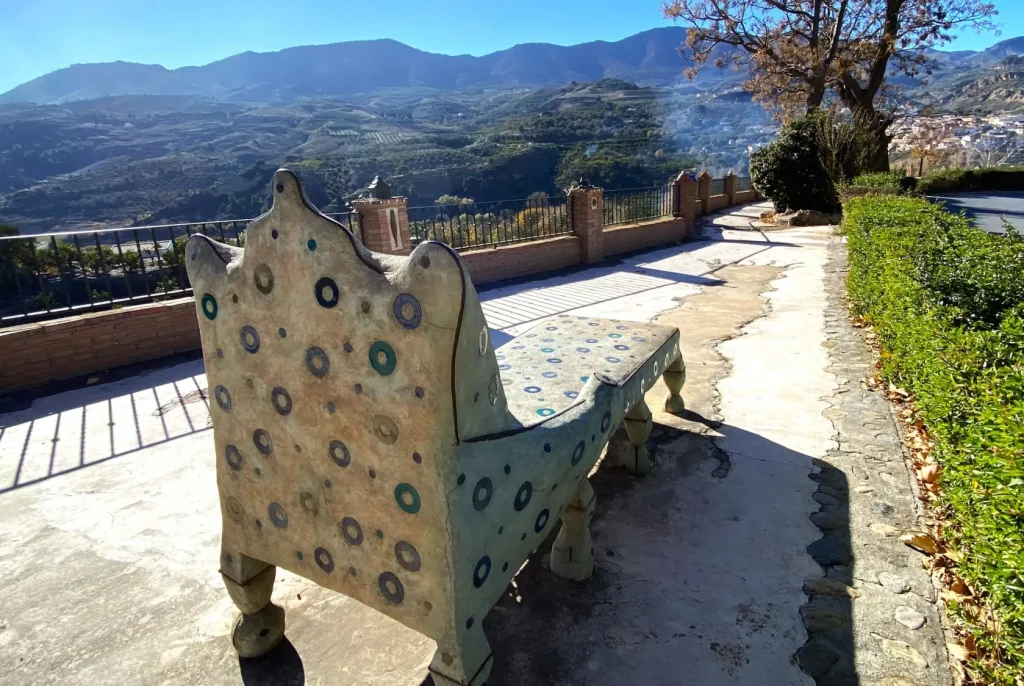 Hemos iniciado la ruta en Melegís para ir ascendiendo hacia Murchas por el río Torrente, subir después al Castillo de Lojuela, y regresar a Melegís siguiendo el valle del río Dúrcal. En el mirador una serie de bancos y sillones de piedra invitan a relajarse admirando el paisaje, y figuras fantásticas lo decoran.