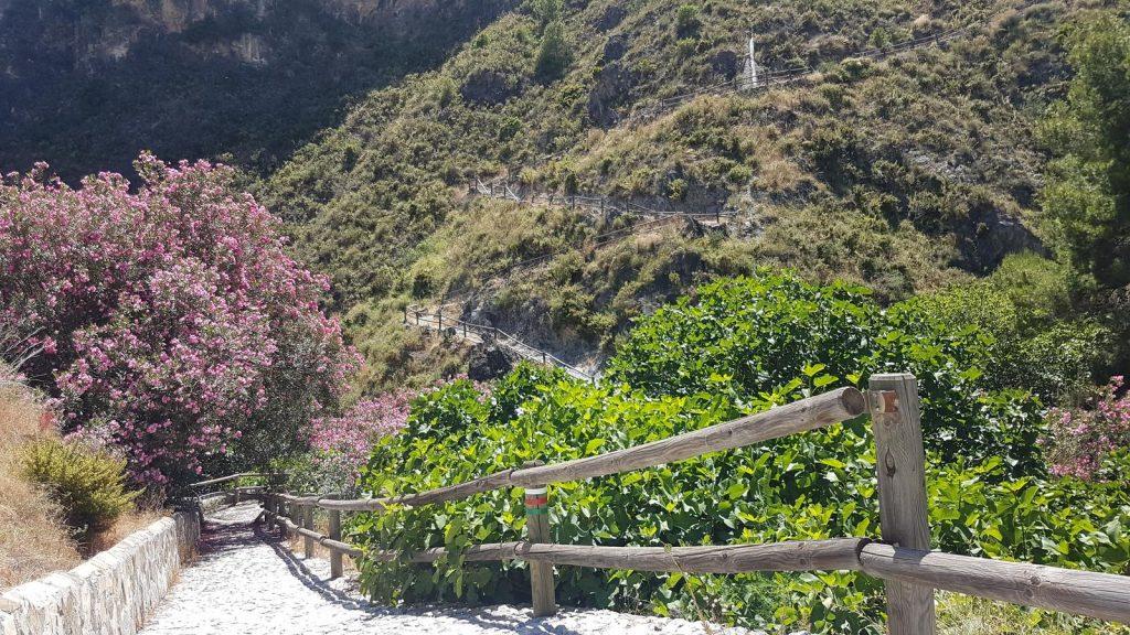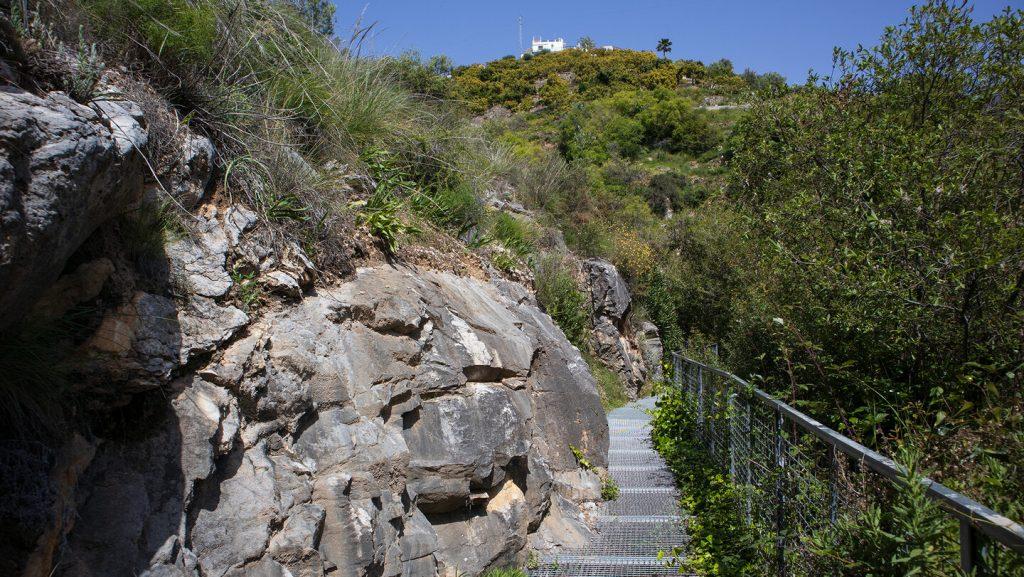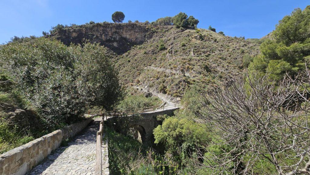 Comenzamos en Árchez, discurriendo junto a la ribera del río Turvilla. El nivel uno atraviesa el pueblo, por lo que vamos a hacer un poquito de turismo, y vamos a disfrutar de unos rincones maravillosos. Seguimos la ruta dirección a Canillas de Albaida por la calle Axarquía descendiendo por la calzada romana hasta el puente sobre el río Turvilla, lo cruzamos y justo aquí el sendero discurre por encima de una acequia en la que se ha habilitado el paso con una pasarela metálica. Este tramo discurre entre afloramientos rocosos y nos permite disfrutar de un paisaje de singular belleza hasta llegar de nuevo a Árchez.