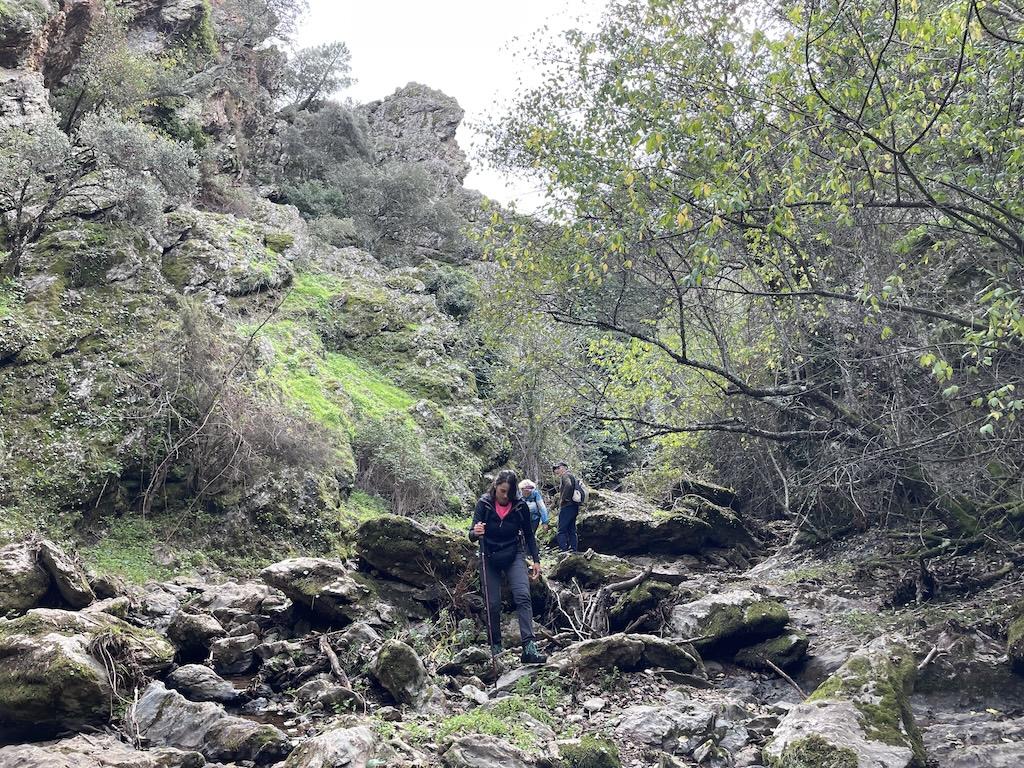 Empezamos la subida y tras bajar al barranco Dundún se ascendería a la aldea de Navahermosa por el camino antiguo de las huertas, pero nosotros nos desviamos a la derecha tras cruzar el Dundún, siguiendo un sendero menos transitado que acompaña un barranco escondido por su vegetación.
